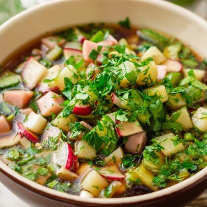 Ветчина, картофель, свекла, яйцо, свежий огурец, зелень, сметана, горчица