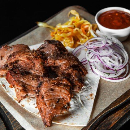 Подаётся на тонком лаваше со свежими овощами, красным луком и томатным соусом собственного производства