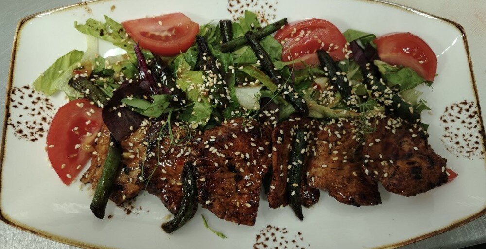 Филе индейки обжаренное в тайском соусе, рукола, стручковая фасоль, вяленые томаты