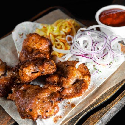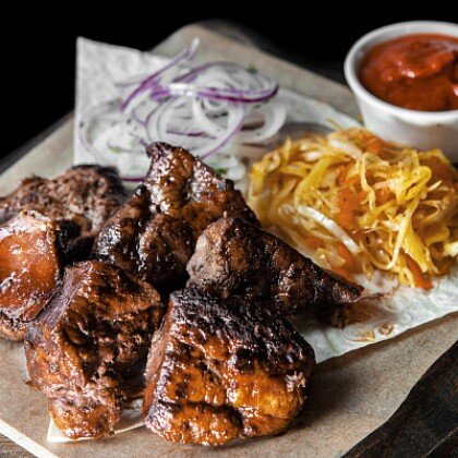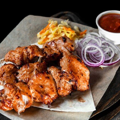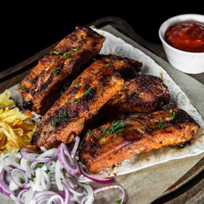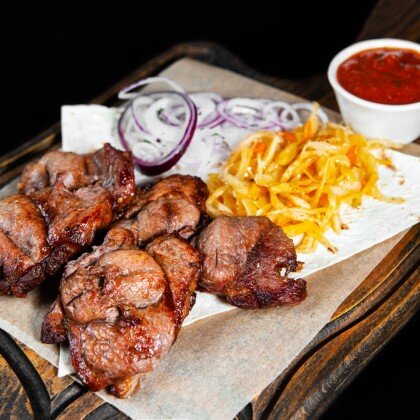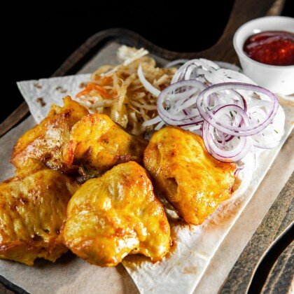 Подаётся на тонком лаваше со свежими овощами, красным луком и томатным соусом собственного производства